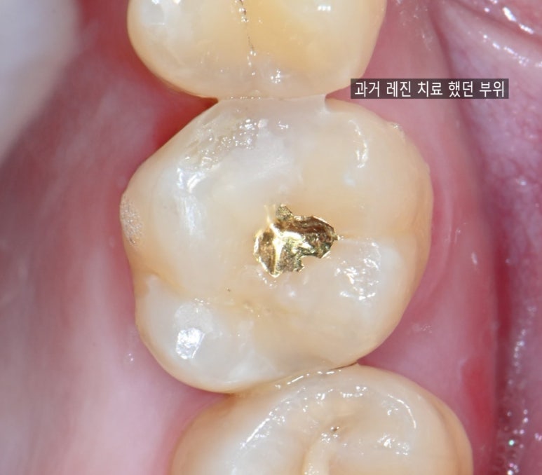 금 인레이를 제거하고 레진으로 교체하는 치료를