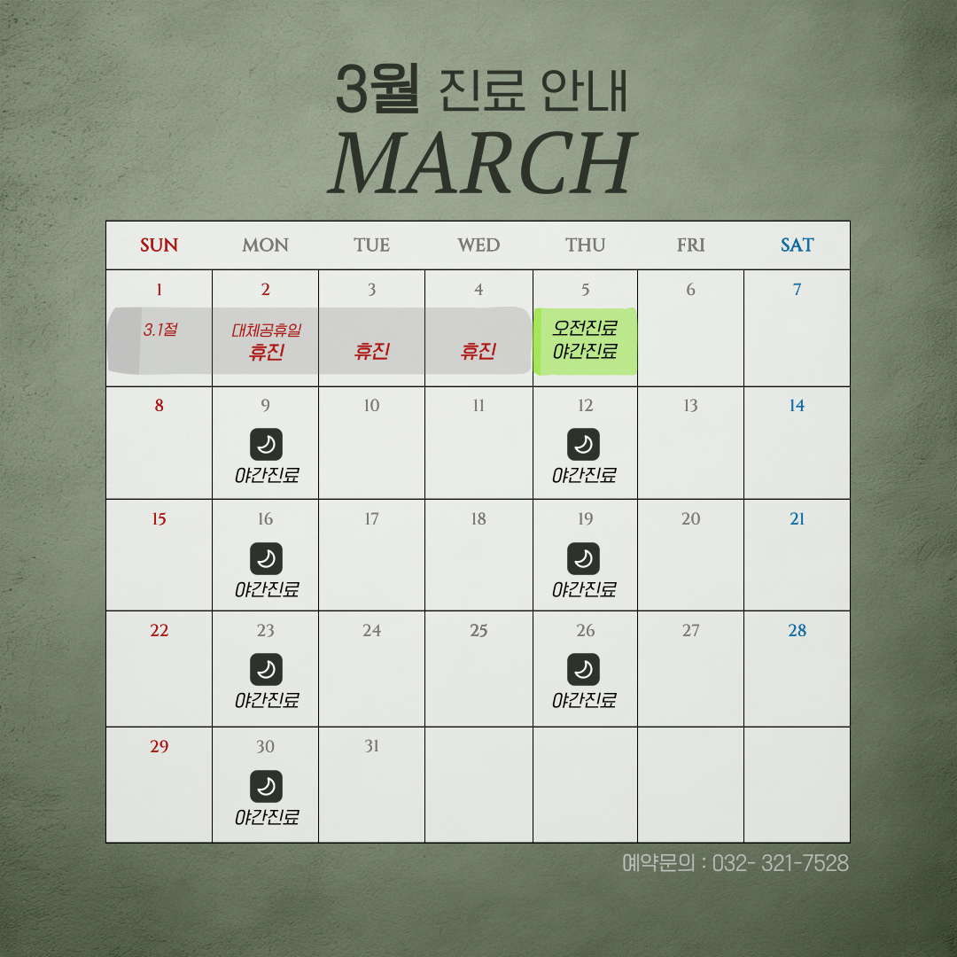 3월 5일 목요일은 오전진료 있습니다.